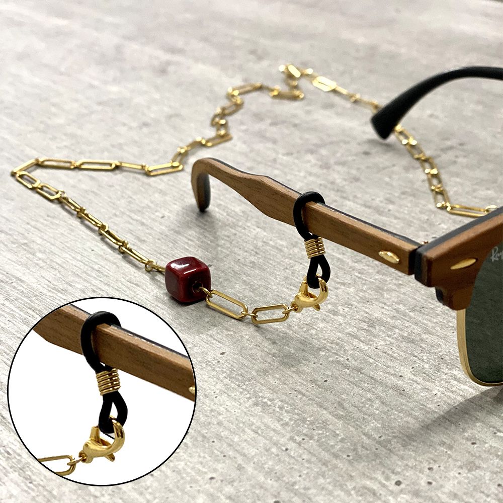 Χειροποίητη αλυσίδα 3 σε 1. Μπορεί να χρησιμοποιηθεί ως αλυσίδα μάσκας, ως αλυσίδα γυαλιών αν προσθέσετε τα λαστιχάκια στις άκρες και σαν κολιέ αν κουμπώσετε τις δύο άκρες μεταξύ τους. Είναι κατασκευασμένη από ανοξείδωτο ατσάλι επιχρυσωμένο που δεν μαυρίζει και δεν προκαλεί αλλεργίες και έχει κουμπώματα ασφαλείας. Μήκος 70cm.