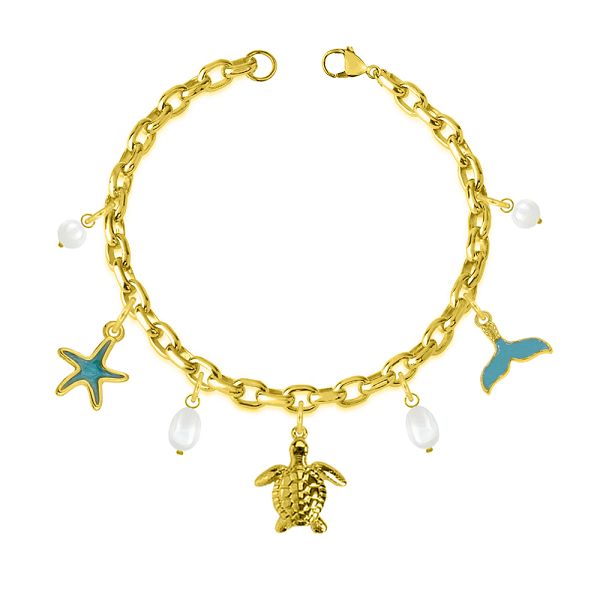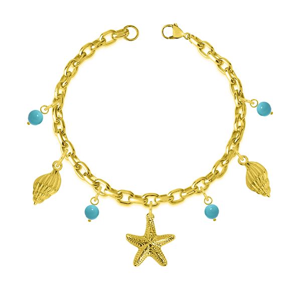 Βραχιόλι Από Ατσάλι Επιχρυσωμένο Με Κοχύλι, Χελώνα Και Αστερία AA29737