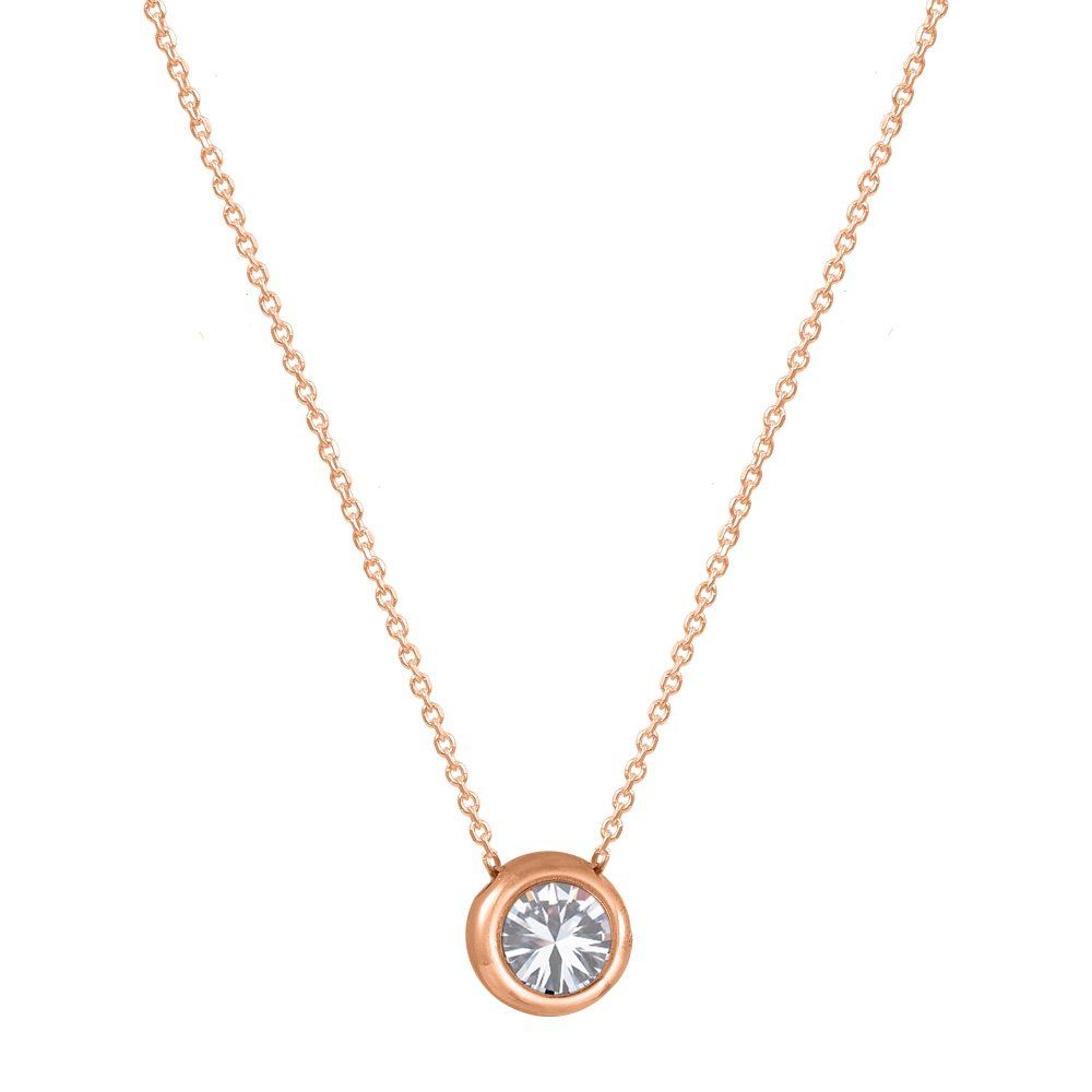 Ένα μοναδικό χειροποίητο κολιέ μονόπετρο της εταιρείας AMOR AMOR από ασήμι 925 ροζ επιχρυσωμένο με πέτρα Swarovski και κούμπωμα ασφαλείας.