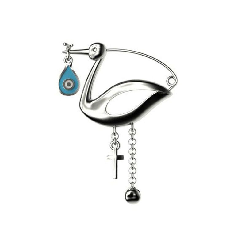 Μοναδικη χειροποίητη παραμάνα της εταιρείας AMOR AMOR από ασήμι 925 επιπλατινωμένο με πελαργό, ματάκι από σμάλτο και σταυρό.