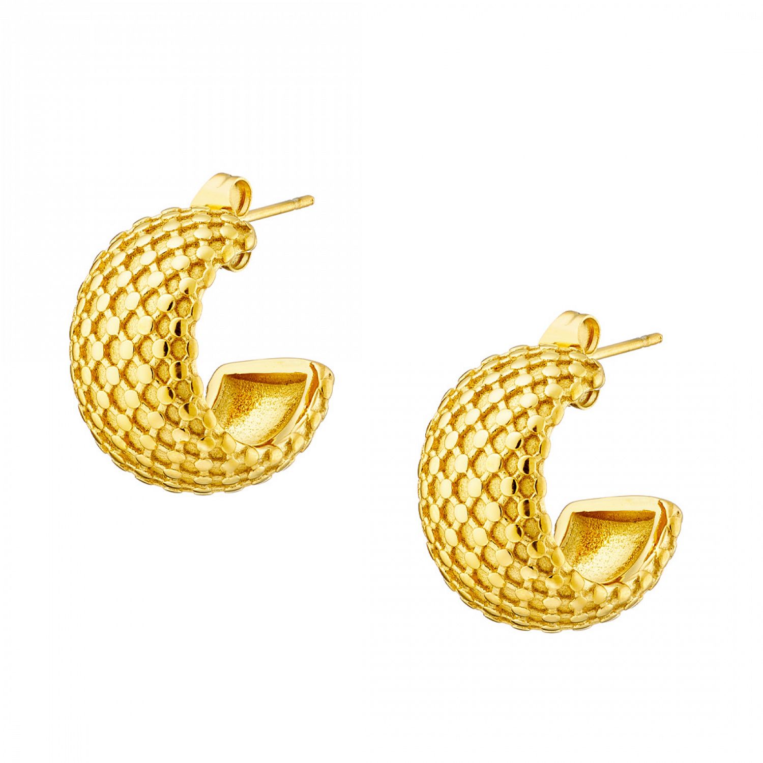 Μοναδικά χειροποίητα σκουλαρίκια κρίκοι της εταιρείας AMOR AMOR από ανοξείδωτο ατσάλι επιχρυσωμένο 24Κ με κούμπωμα ασφαλείας. Κόσμημα από ανοξείδωτο ατσάλι δεν μπορεί σε καμία περίπτωση να υποστεί οξείδωση (σκουριά), δεν μαυρίζει ποτέ και ασφαλώς δεν δημιουργεί αλλεργίες (υποαλλεργικό). Μπορεί να φορεθεί καθημερινά και χωρίς κανέναν περιορισμό κάτω από οποιεσδήποτε συνθήκες π.χ. επαφή με νερό, ιδρώτα ακόμα και στην θάλασσα. Έτσι λοιπόν, ένα κόσμημα το οποίο είναι κατασκευασμένο από ανοξείδωτο ατσάλι είναι σίγουρο πως θα διατηρήσει για πάντα τη μοναδική λάμψη του.