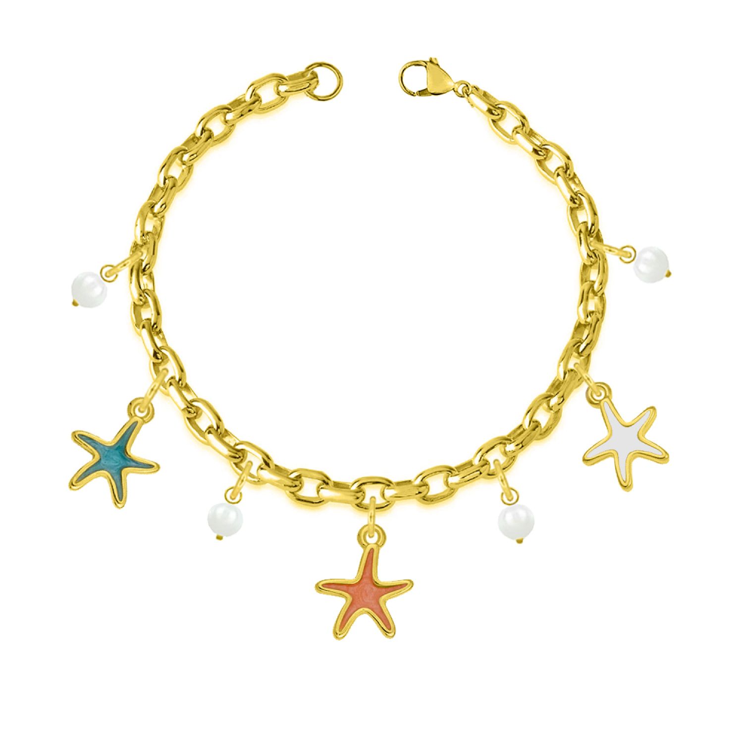 Μοναδικό χειροποίητο βραχιόλι της εταιρείας AMOR AMOR με αλυσίδα και κούμπωμα ασφαλείας από ανοξείδωτο ατσάλι επιχρυσωμένο και charms από ανθεκτικό ορείχαλκο χωρίς νικέλιο. Κόσμημα από ανοξείδωτο ατσάλι δεν μπορεί σε καμία περίπτωση να υποστεί οξείδωση (σκουριά), δεν μαυρίζει ποτέ και ασφαλώς δεν δημιουργεί αλλεργίες (υποαλλεργικό). Μπορεί να φορεθεί καθημερινά και χωρίς κανέναν περιορισμό κάτω από οποιεσδήποτε συνθήκες π.χ. επαφή με νερό, ιδρώτα ακόμα και στην θάλασσα. Έτσι λοιπόν, ένα κόσμημα το οποίο είναι κατασκευασμένο από ανοξείδωτο ατσάλι είναι σίγουρο πως θα διατηρήσει για πάντα τη μοναδική λάμψη του.