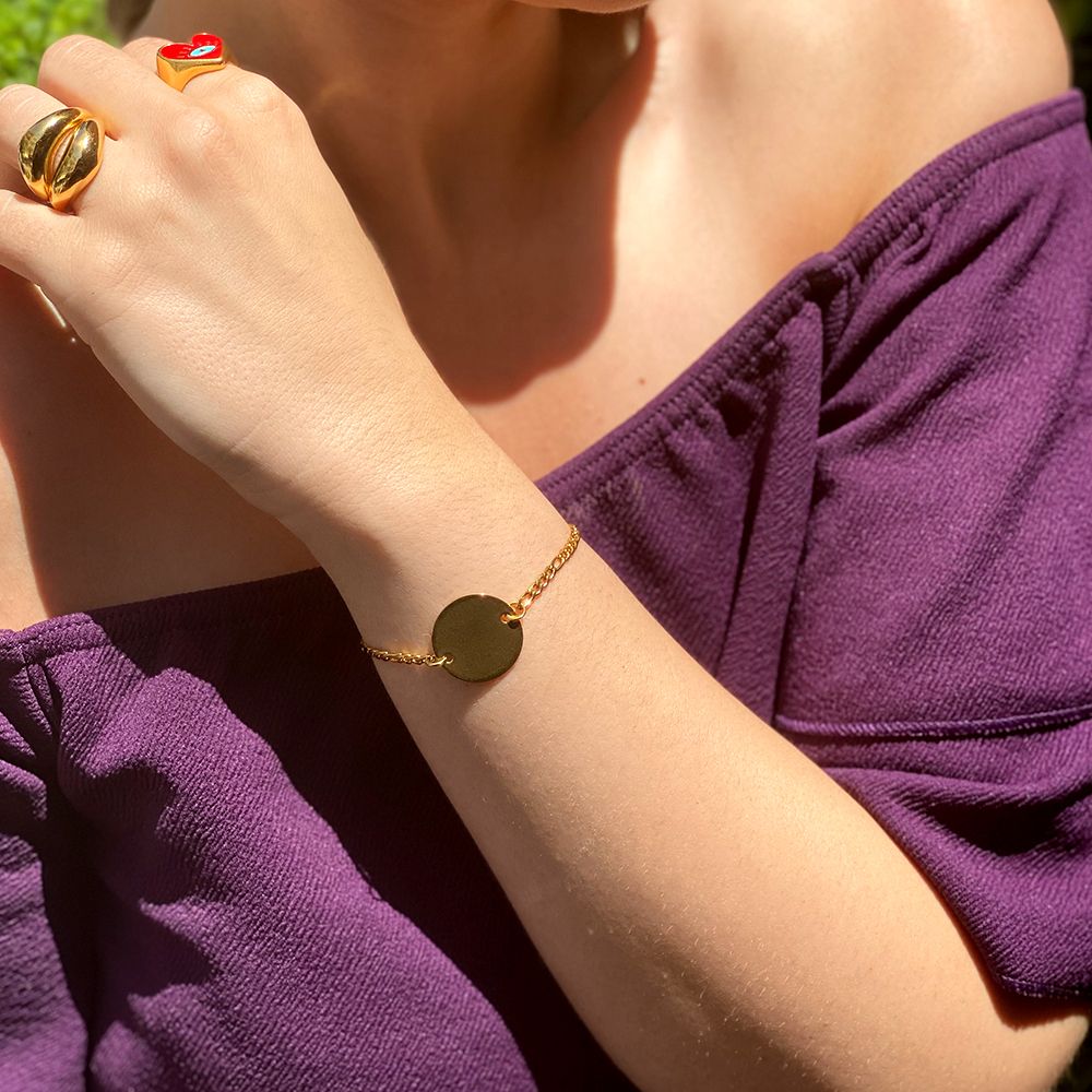 Μοναδικό βραχιόλι ταυτότητα AMOR AMOR με αλυσίδα από ανοξείδωτο ατσάλι επιχρυσωμένο σε μέγεθος που προσαρμόζεται στο χέρι. Διάμετρος μοτίφ 20 mm.