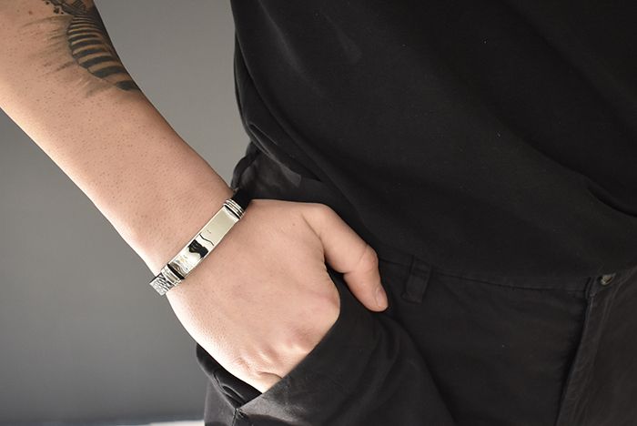 Χειροποίητο βραχιόλι ταυτότητα από δέρμα και ανοξείδωτο ατσάλι με κούμπωμα ασφαλείας.